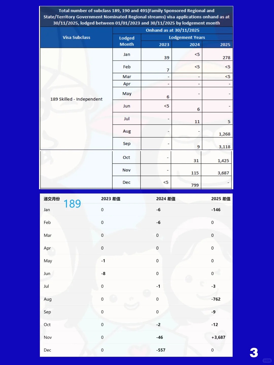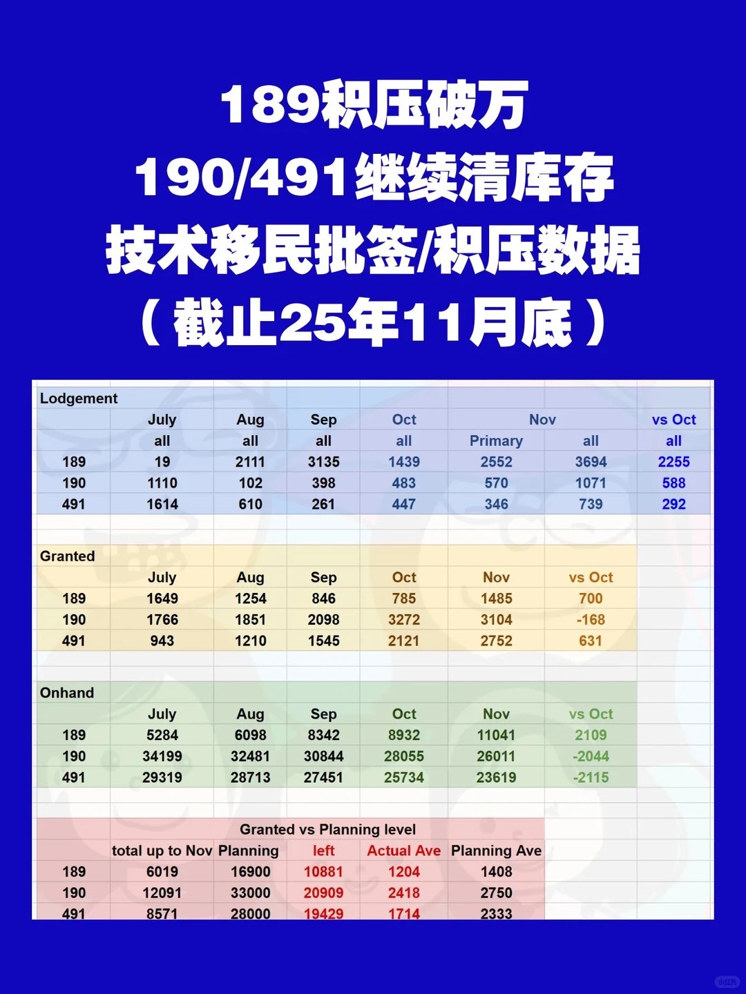 因为新增递交太多,积压继续增加突破一万个,超过了11000个。移民局11月主要在审理24年12月递交的和25年8月递交的,24年12月那批下了557个,还剩下不到800个,11月的清得差不多了还剩下100多个;25年8月递交的批了760+个,还剩下1200+个,9月递交的基本还没开始推进