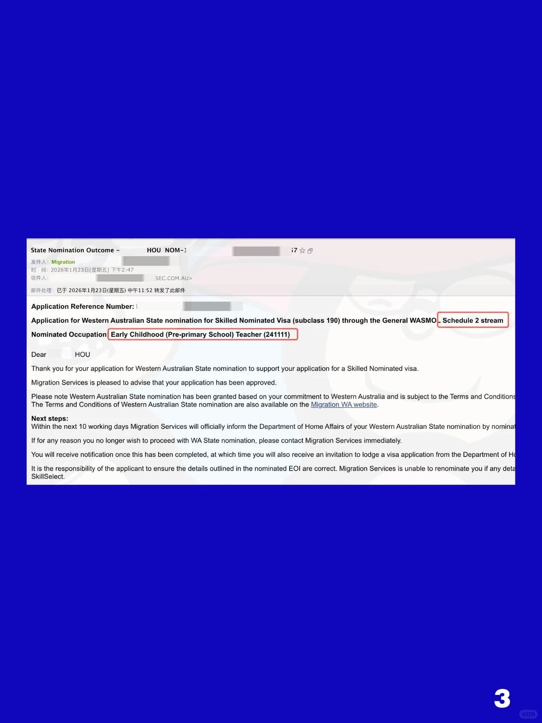客户去年年中开始觉得189越来越难,自己分数也不是很高,所以果断选择去西澳了。在西澳顺利找到幼教相关工作之后,不到半年时间,去年12月以80分+5拿到西澳190预邀请,今天也下了正式邀请