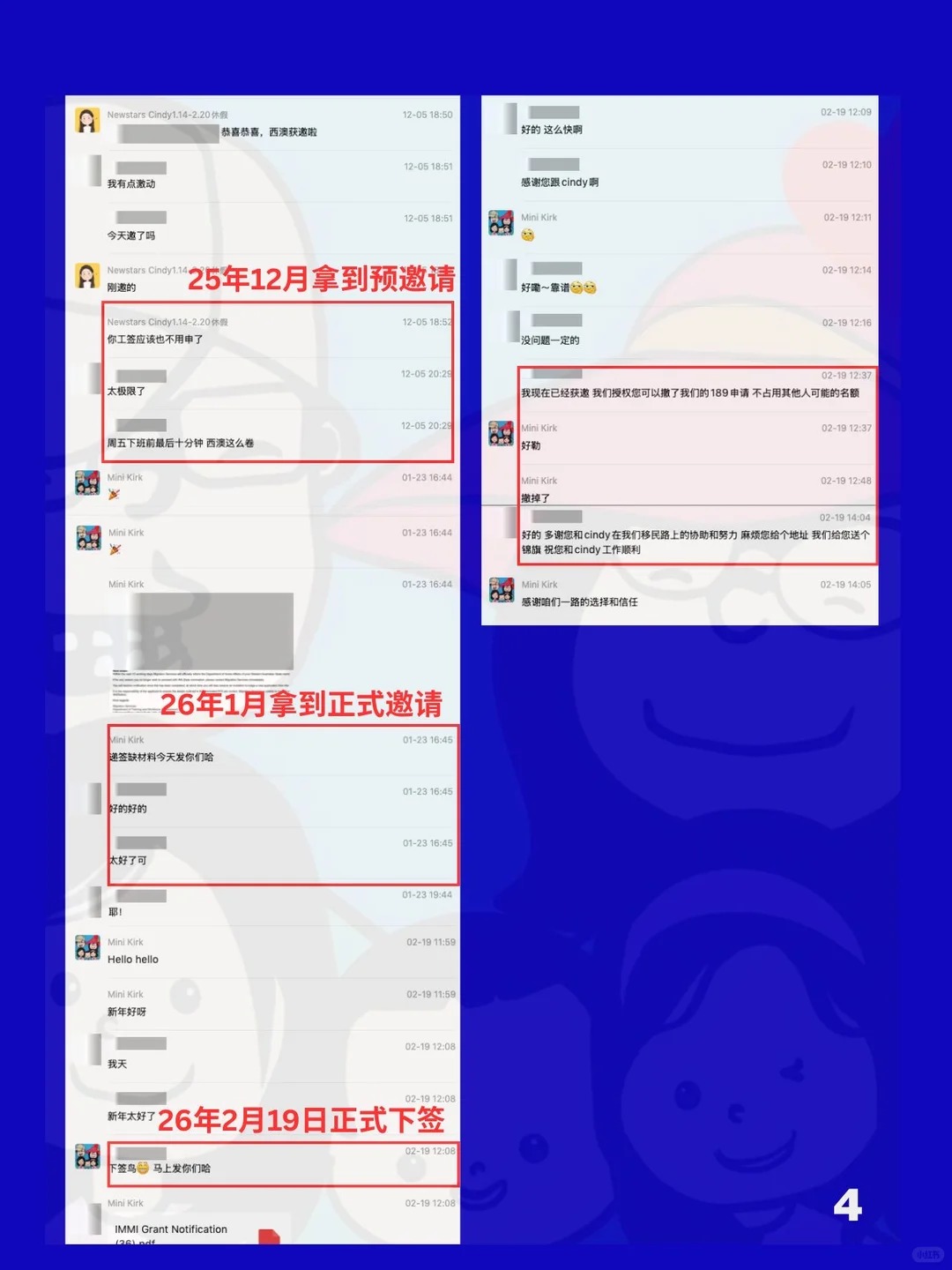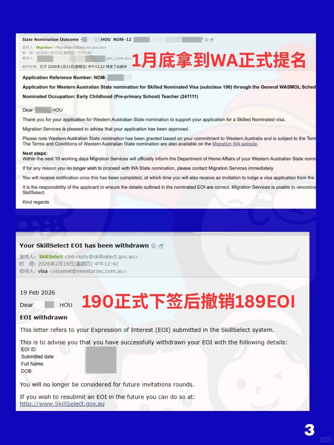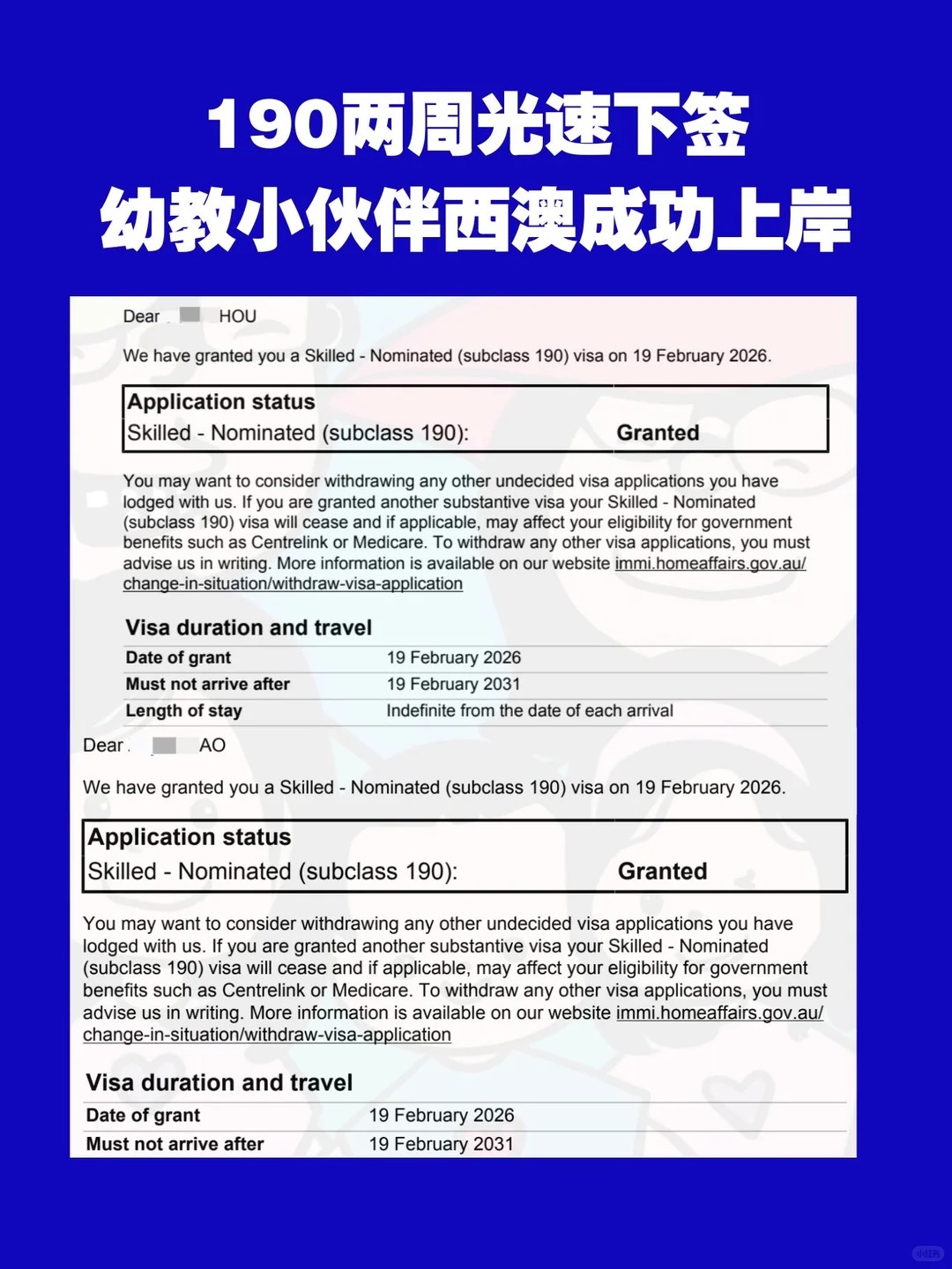 幸运的是,搬去西澳之后几个月就找到了幼教相关工作,并且在去年12月以805拿到了西澳预邀请,今年1月底拿到了正式邀请,2月初递交了190签证,仅半个月,2月19号光速下签(图3)时间线见图4