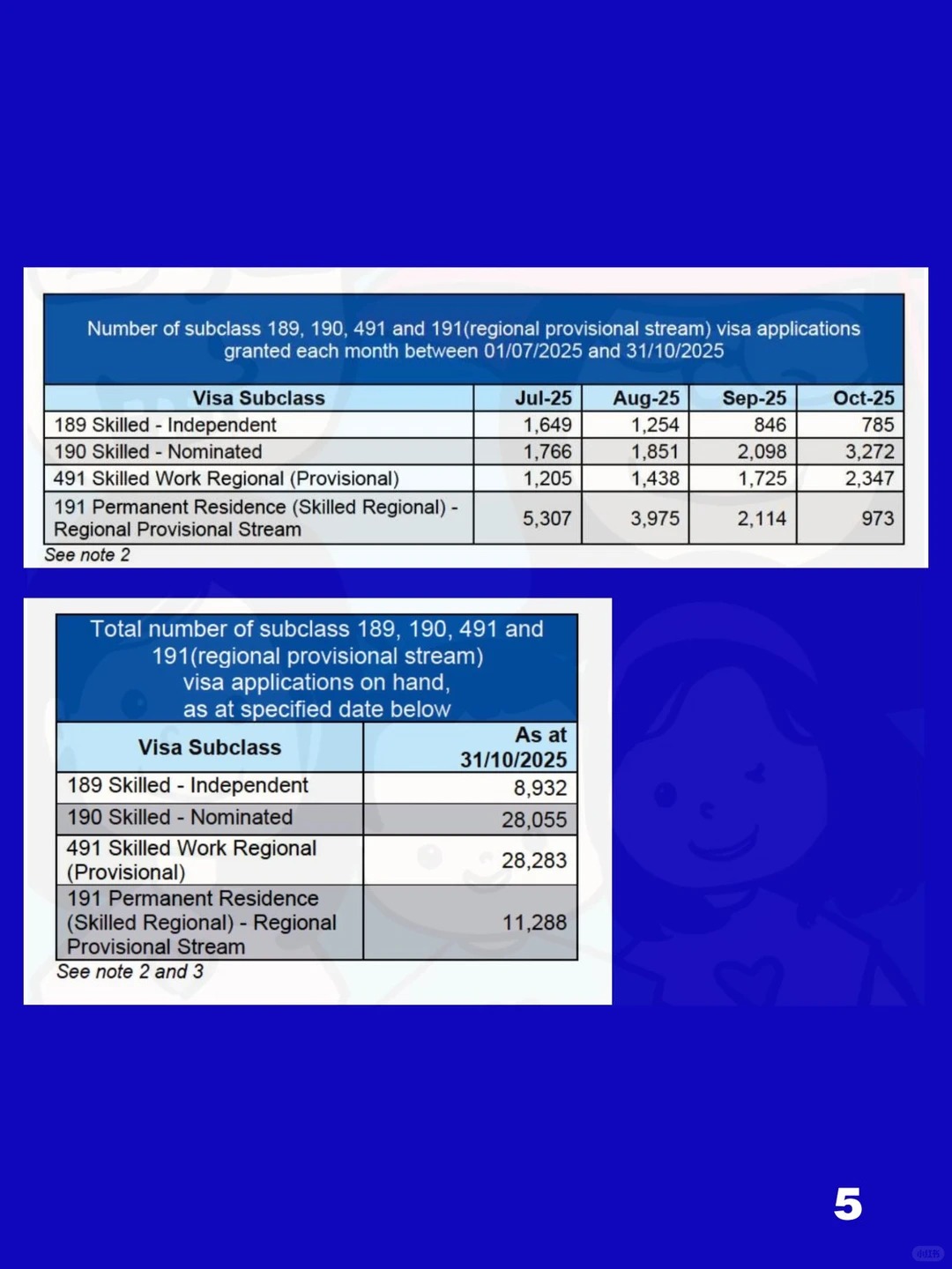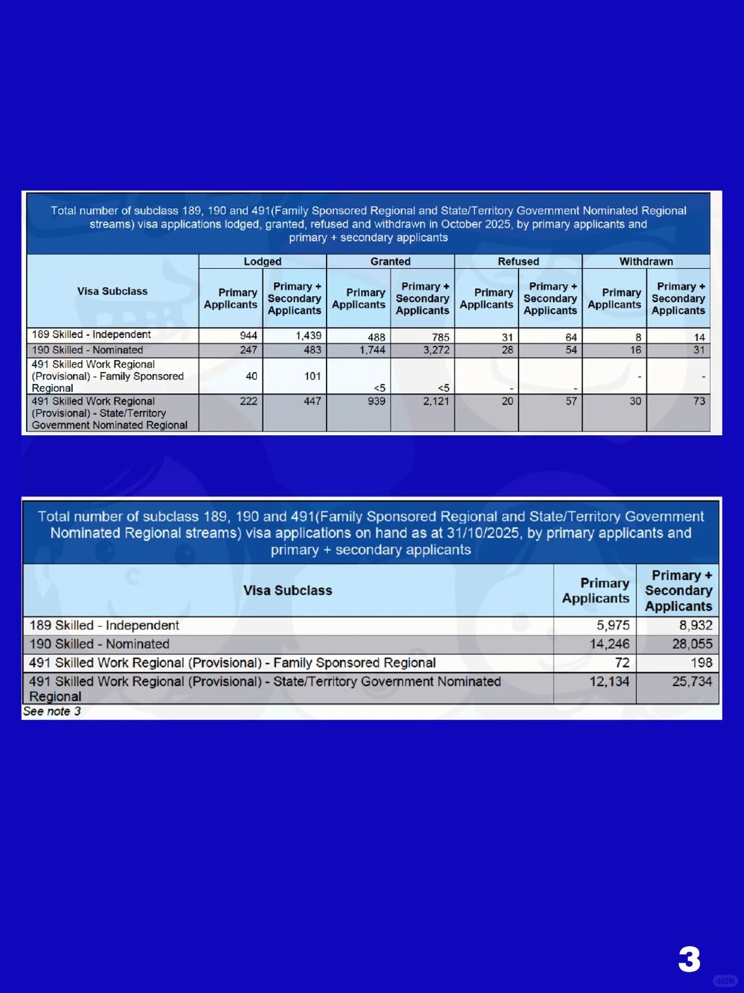 递交数量有1439个,比9月少了1696个,所以八月到十月的主申递签数是4631(944+2142+1545)。意味着八月那轮189邀请的实际接受率为67%,相对以往这个比例算是比较高的。下了785个签证,稍微减少61个,实际审理速度还是低于配额应有的平均速度。积压目前是不到9000个,预计从11月底的数据开始能看到较大的涨幅。189在10月还是在清理24年12月递交的申请,进入11月后我们有些25年8月递交的客户有下签。