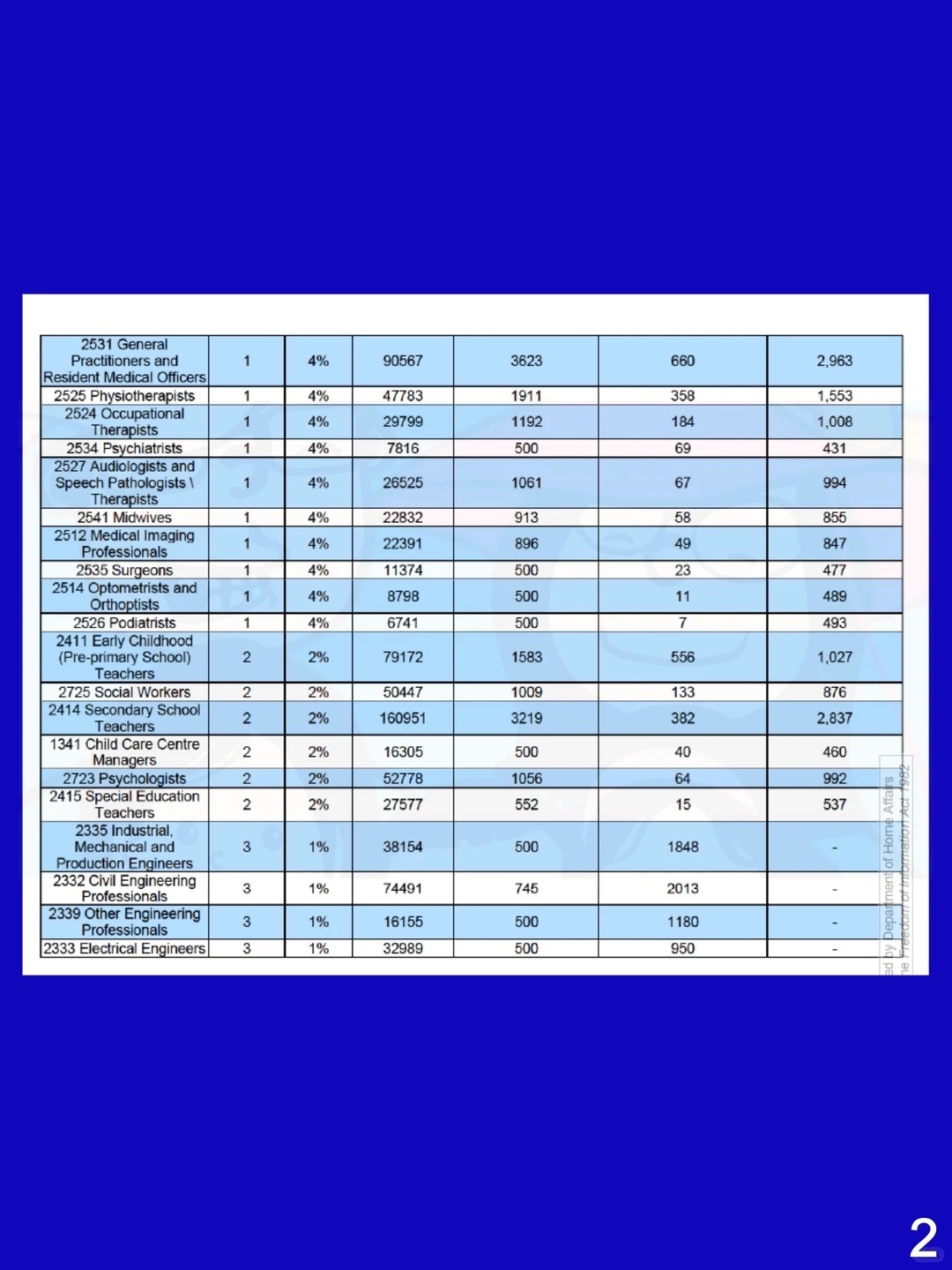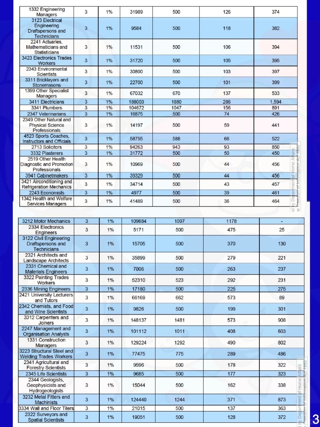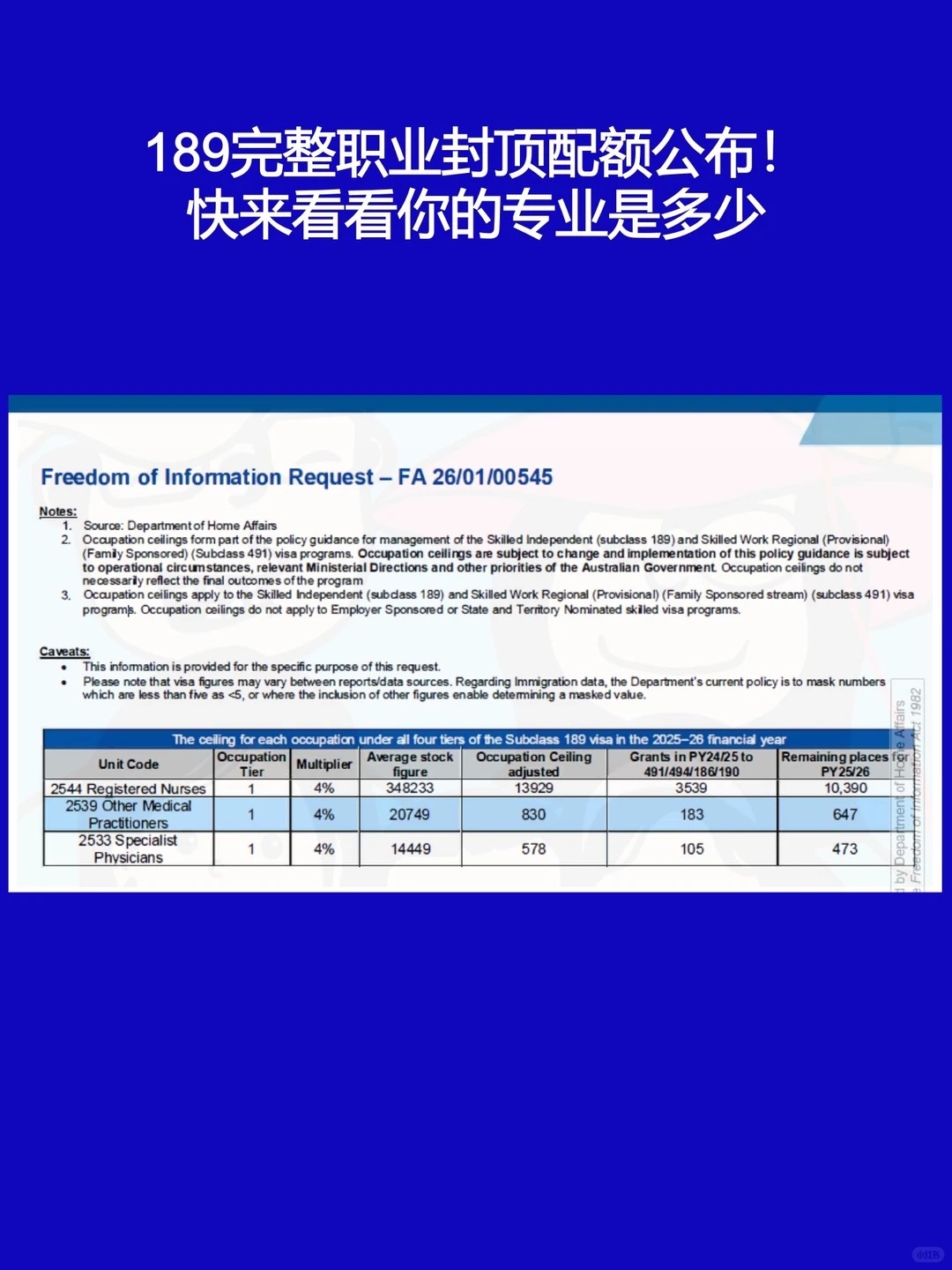 这个表格由左到右分别是各个职业名称、职业tier,以及占比,澳洲劳动力市场的平均从业人数、本财年该职业的理论上限名额,上财年已经批复的491/494/186/190的数量,最后一览是各个职业本财年189的邀请名额上限