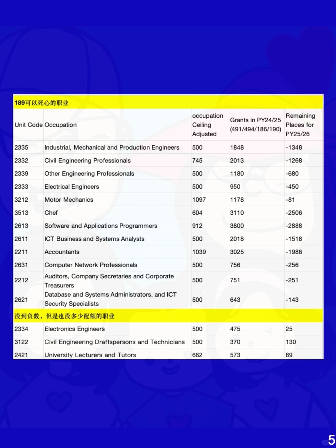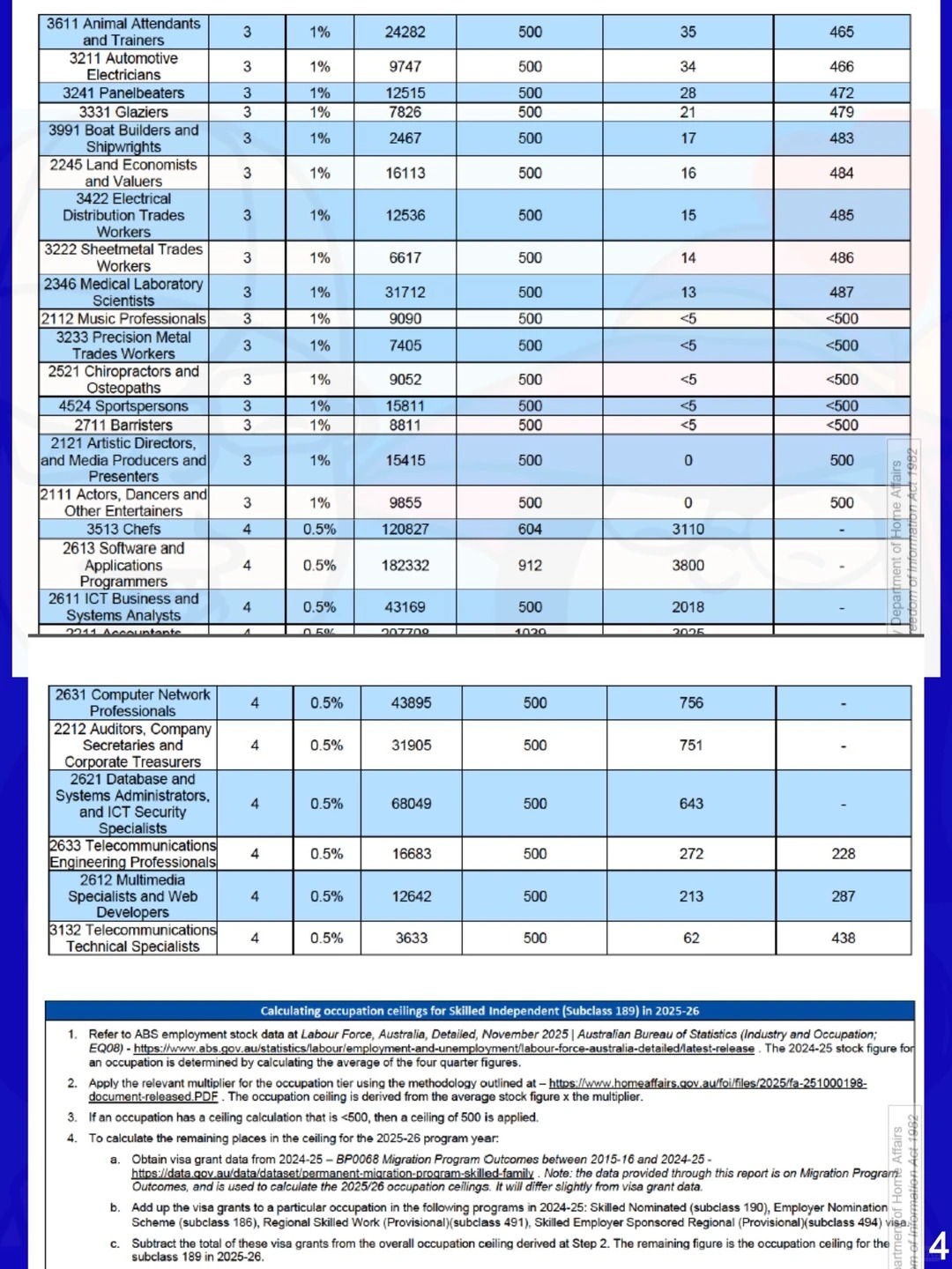 2. 500是根据tier级别(也就是比例)和从业人数算出该职业组25-26财年技术移民的配额数,最低硬性下限是500个,再减去24-25财年491/494/190/186的下签数,得出该职业组189在25-26财年的配额数,0配额的职业算出的数字都是负数