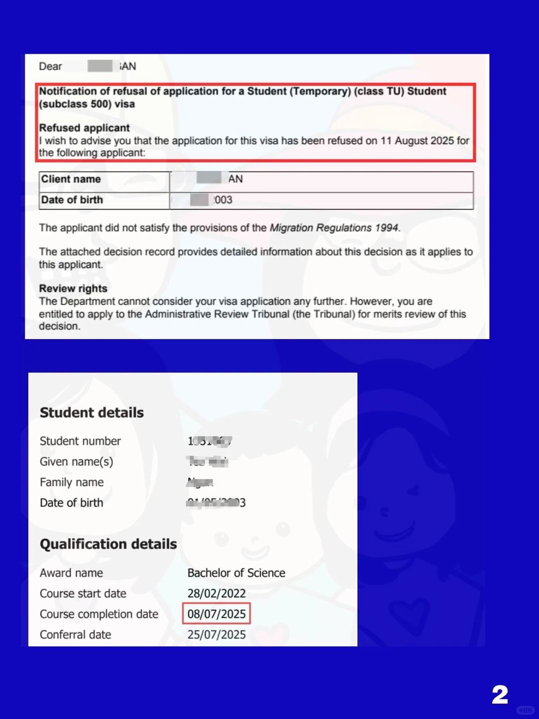 由于客户已经毕业,且8月11号收到拒信(图2),在上诉成功后,虽然学签打回处理,但如果没能继续在读,移民局仍有可能拒签。因此,我们必须为客户提前安排好新的学校和课程,确保他符合学签下签要求