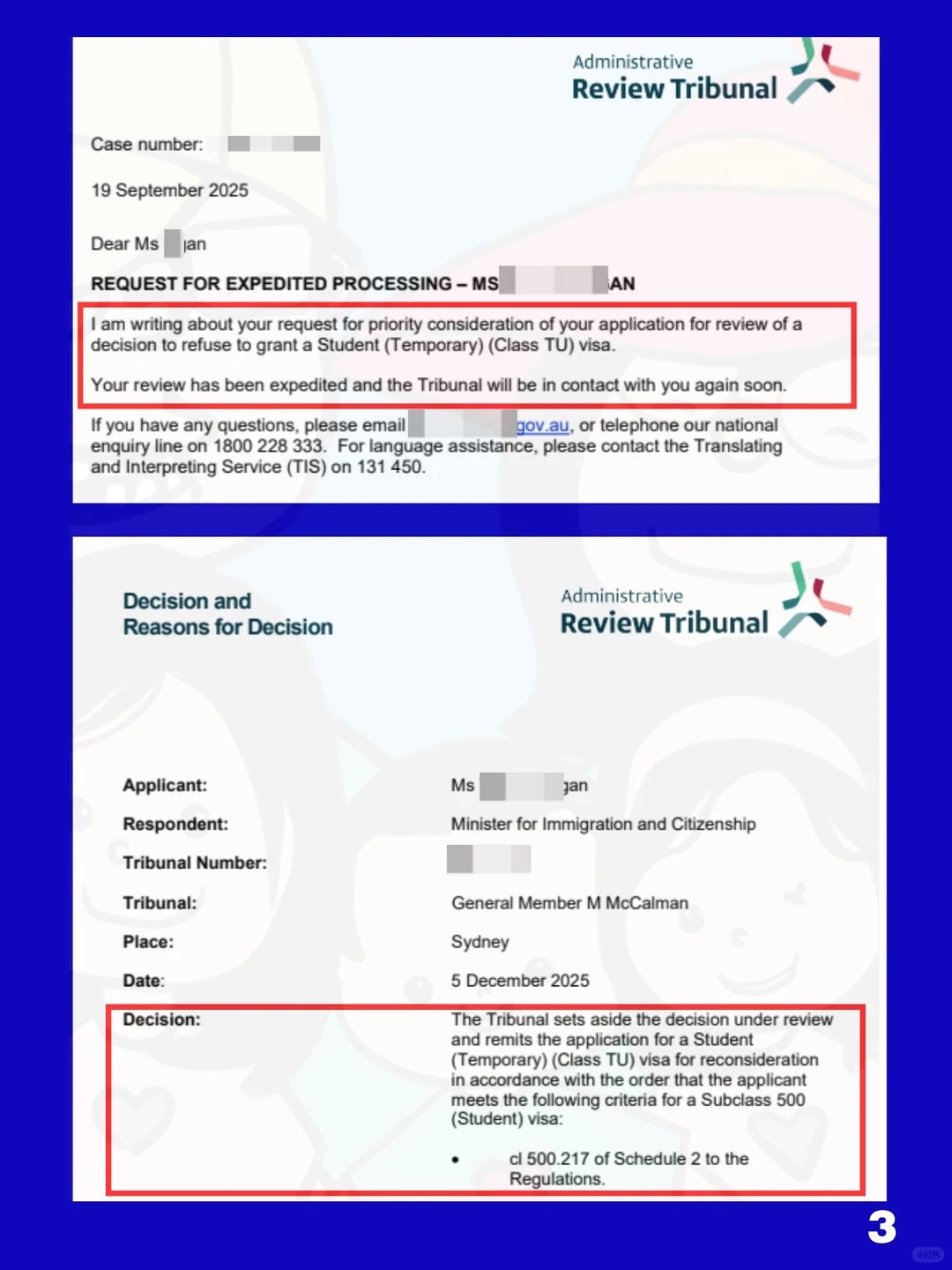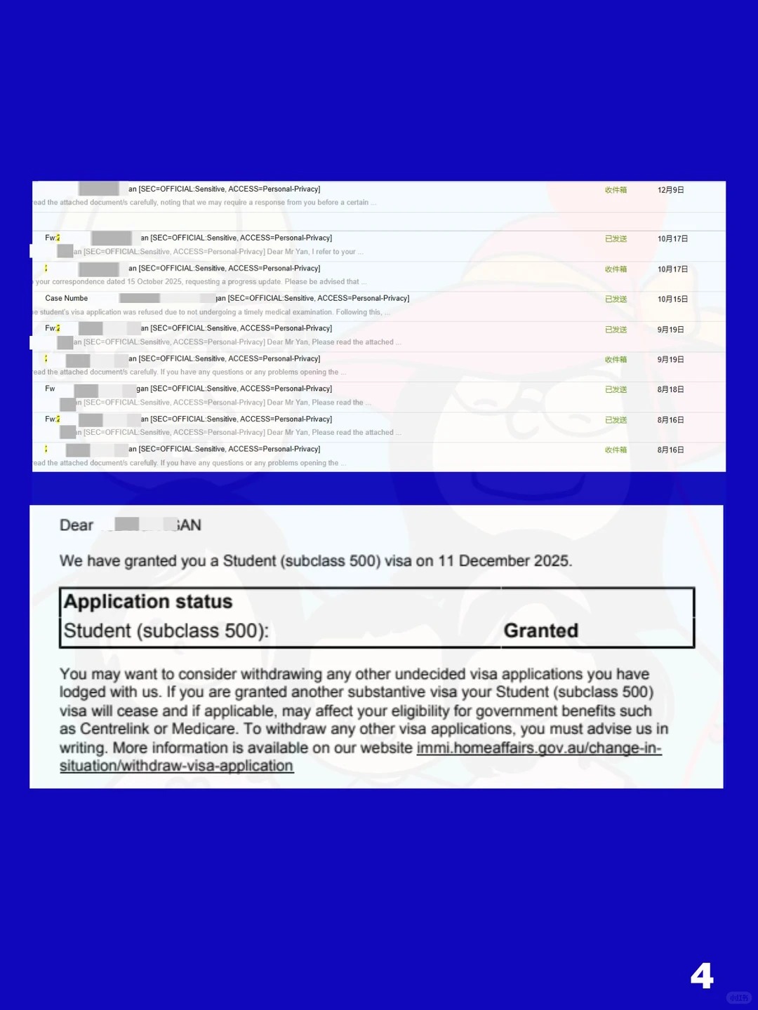 在我们充分准备材料的情况下,终于帮助客户上诉成功(图3),成功拿回500学签(图4)。也尽快安排递交了485工签,要知道已经临近12月中,离课程完结的时间已经超过了5个月,在还有不到20天的时间就没办法申请485工签!递交485当天,就下签了5年的工作签证!