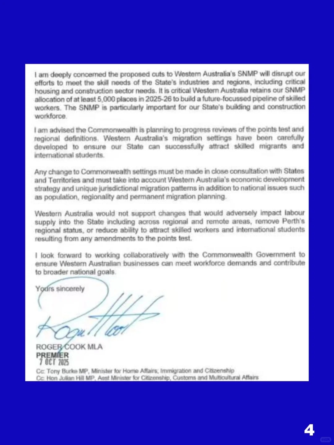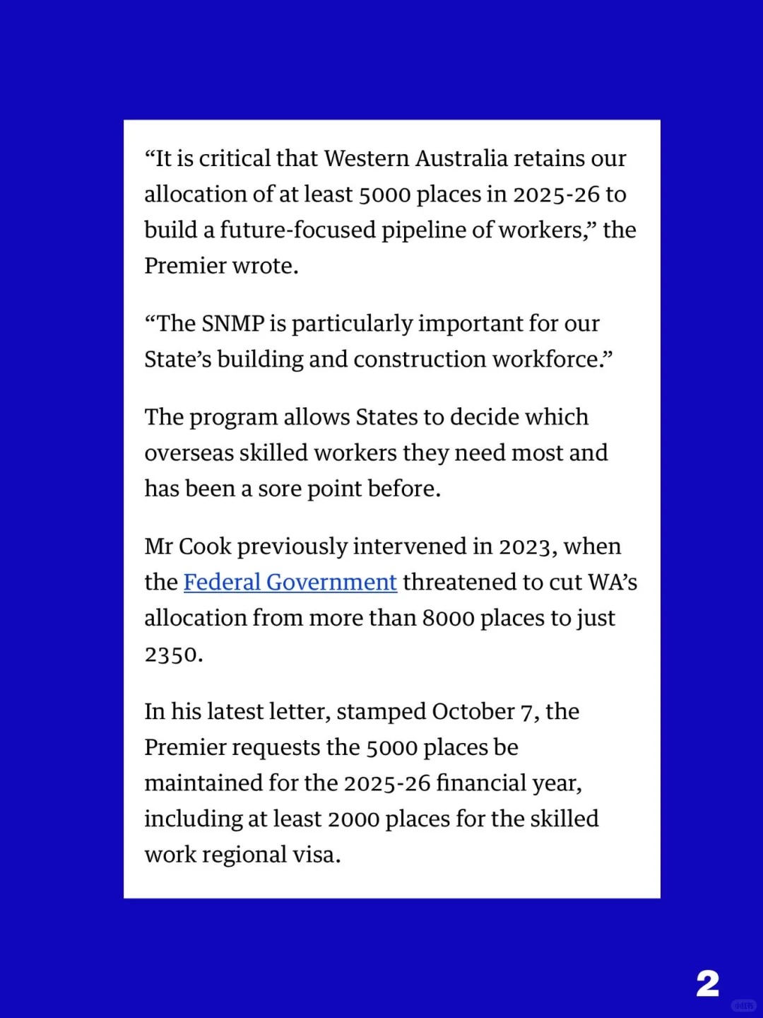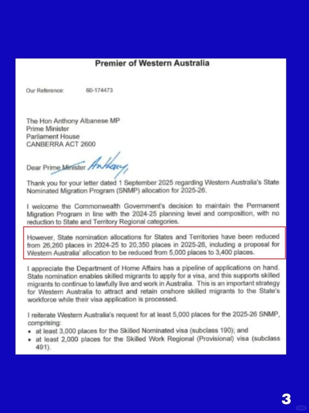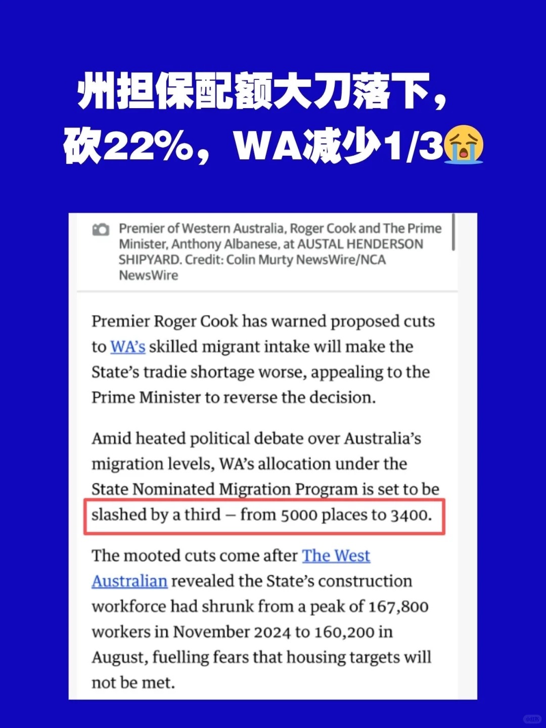 而西澳州长的信中也提到全部各州的总配额26260个,可能会减少到20350个,减少5910个,砍22%左右。意味着其他州还要一共减少4310个名额,可能各个州都有不同程度的减少,只是目前看来西澳更惨了些。而且联邦也在考虑将perth移除偏远地区,州长也是明确表示反对,这才被加回来几年又要被移走了,朝令夕改又一个现实的案子,申请人无从规划