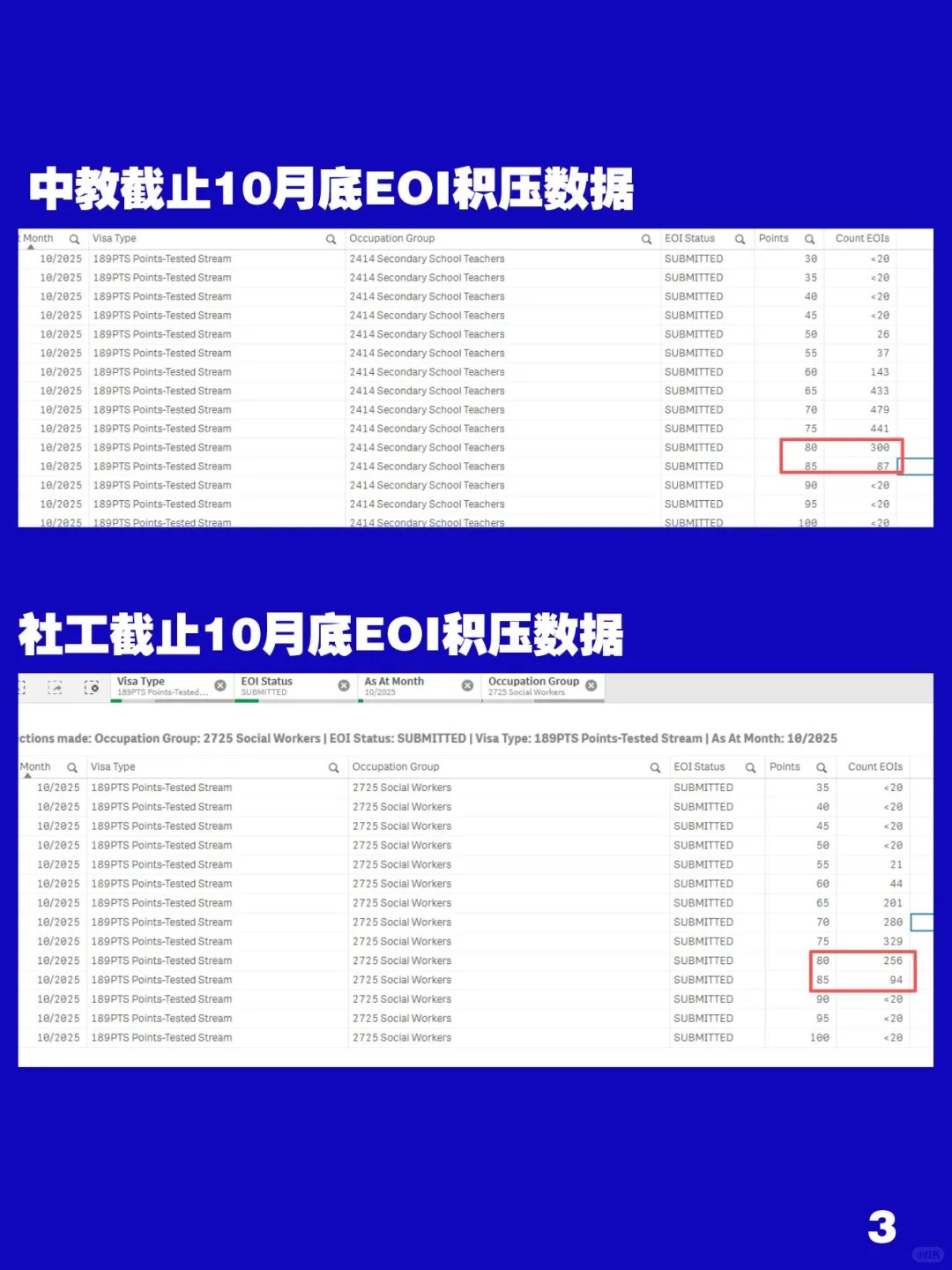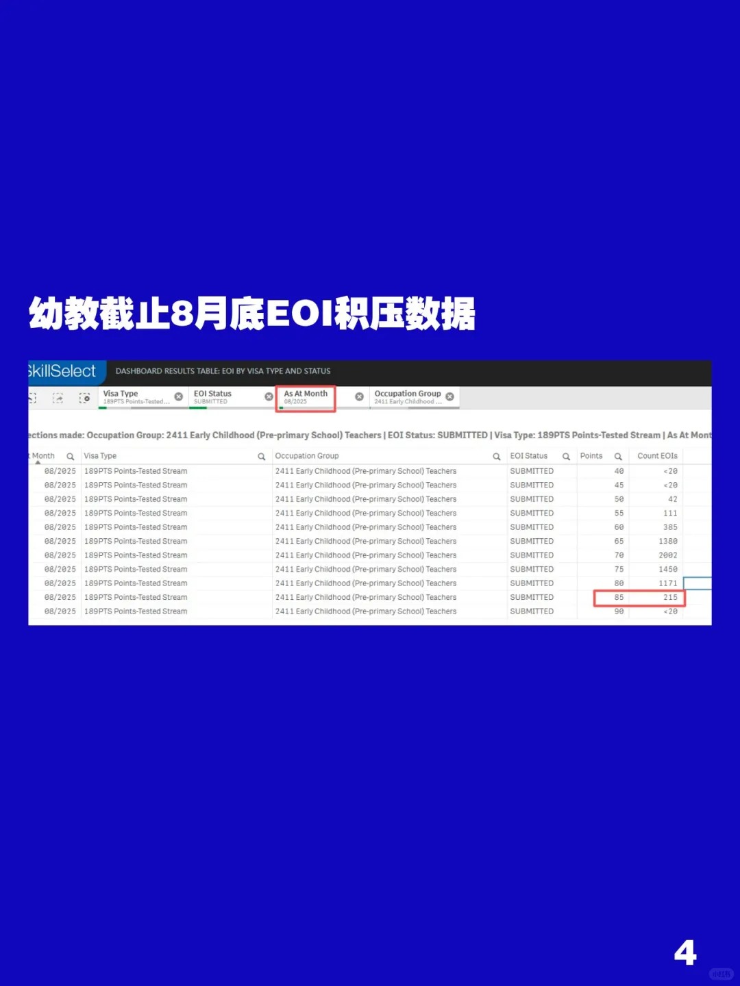 幼教明显持续承压,一方面申请人持续攀升,另外一方面邀请数并没有跟着涨,直接的结果就是除了邀请分数继续维持85分,此轮推进的速度也明显比上一轮慢,只推进到25年8月底,截止到8月底,还没有获邀请的85分当时是215个(图4),也就是此轮幼教预计只发200来个,对比护理可能连零头都不到,而且也比中教社工等发的少。有越来越多幼教毕业入池,如果移民局不增加邀请数,那幼教85分走189也不保险了