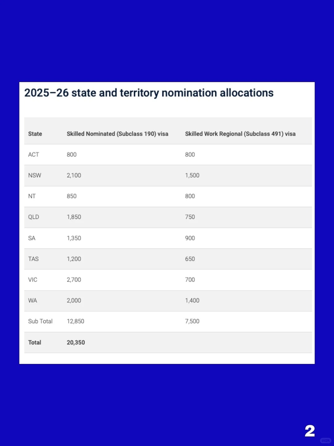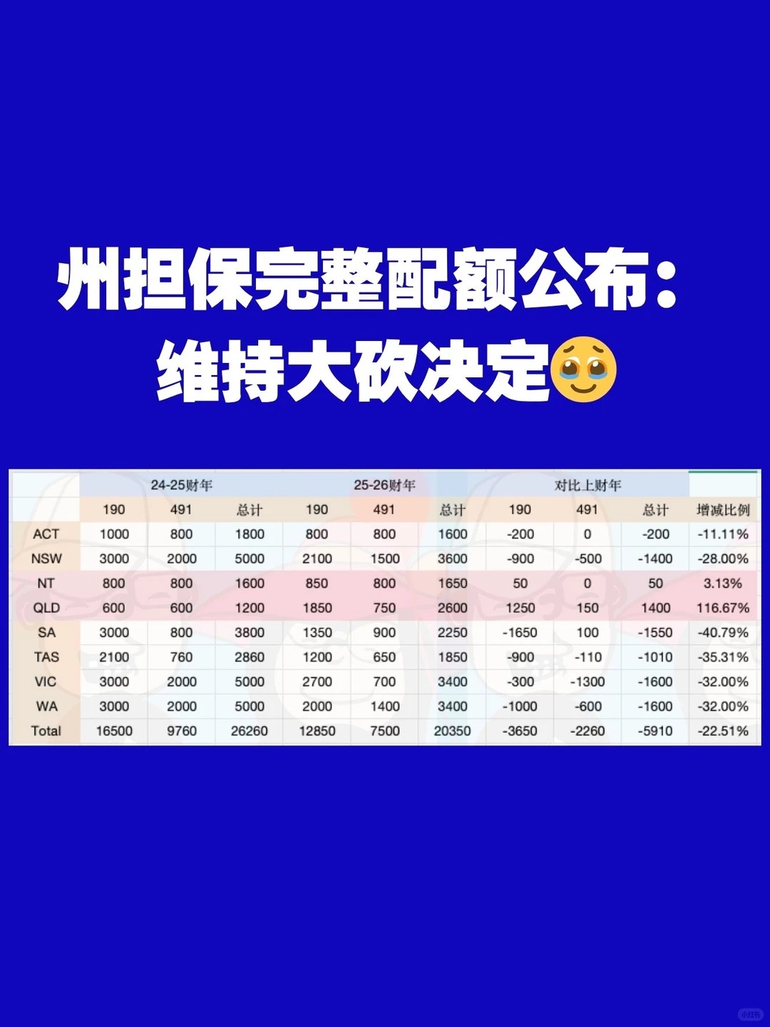 其他州都是减少,190减少最多的是SA,被大砍1650,WA也被减少1000个,NSW和TAS各减少900个,VIC减少300个,堪培拉减少200。