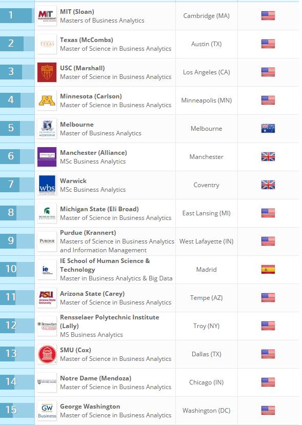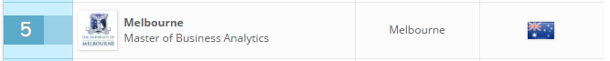榜单上的45所大学中,澳洲只有墨尔本大学榜上有名,对应的专业是Master of Business Analytics,但是排到了世界第五位!