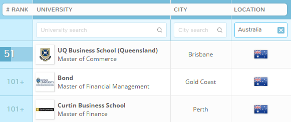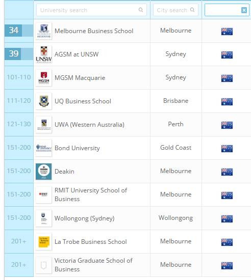 榜单上的131所大学中,出现了三所澳洲大学,排名最好的是昆士兰大学商学院,对应的专业Master of Commerce,排在第51位;