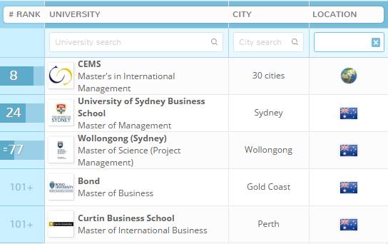 榜单上的122所大学中,有四所澳洲大学的身影(CEMS在全球30个城市都有分校),最好的悉尼商学院Master of Management位列世界第24位;卧龙岗大学的Master of Science(Project Management)也进入百强,位列第77位;另外两个是邦德大学的Master of Business和科廷商学院的Master of International Business。