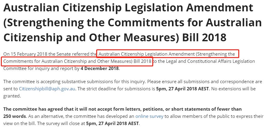 参议院在2月18号正式提请法律和宪法事务委员会Legal and Constitutional Affairs Legislation Committee对澳洲入籍修改法案进行调查,并在2018年12月4号之前提交完整报告。