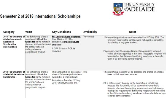 申请条件:尽早接受offer确认入学,先到先得,在南澳时间2018年5月15日关闭,或者在其他奖学金发放完之后关闭