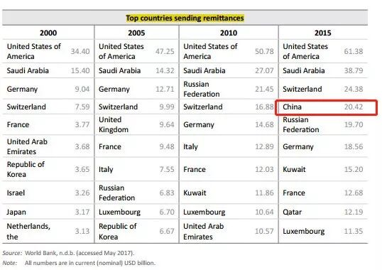 同时,从中国汇出去的钱也不少,2015年排在全球第四,总额达到204.2亿美元。