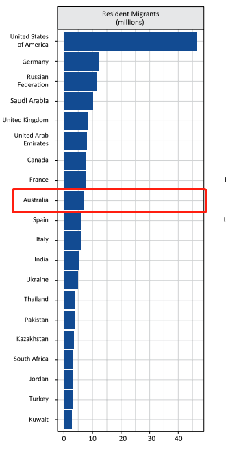 总数不断上升,但不同区域/国家的移民占比却有很大差异,如下图显示颜色越深移民占总人口的比例越高,澳洲明显属于较高比例的,有28.2%,美国是14.5%,最高是阿联酋的88.4%。