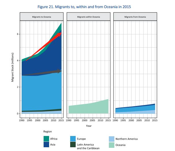以澳洲和新西兰两个国家为主的大洋洲区域属于多进少出的地区,进入的移民主要来自亚洲和欧洲,如下图所示欧洲移民因为历史原因,一直保持一定的数量和增长速度,而来自亚洲的移民则从千禧年开始迅猛上升。