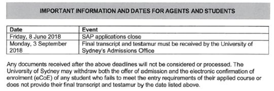本周五6月8日是申请SAP的截止日期,申请者需要在9月3日将最终成绩单和毕业证递交给悉尼大学。