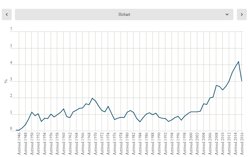 下图是2011年和2016年人口普查,各个首府城市海外出生比例的对比,大部分城市都有上升,ACT、墨尔本和悉尼都是3%的上涨,达尔文上升4%,霍巴特保持在14%。