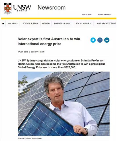在今年的全球能源奖评选中,新南威尔士大学(UNSW)的教授Martin Green击败特斯拉(Tesla)的Elon Musk,成功获奖,并且将于今年10月接由俄罗斯总统普金进行颁奖。