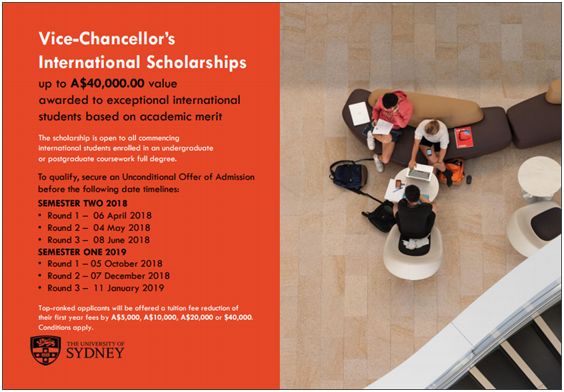 悉尼大学最近公布了2019年semester 1的The Vice-Chancellor’s International Scholarships的申请截止时间,针对2019年第一学期开学拿到full offer的所有国际留学生,一共有三轮申请截止时间。金额为$5,000-$40,000澳币。
