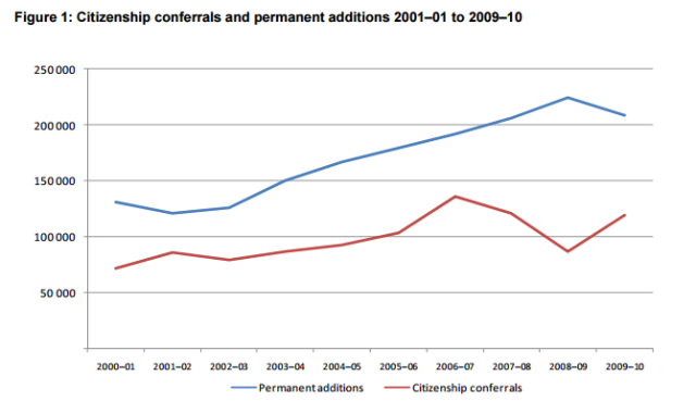 这是00/01到09/10年间,移民和入籍数量的差距。当然,政府宣布准备提高门槛后,会激发很多之前犹豫不决或者不着急的人,赶在新政前递交申请。也因为移民福利有被削减的迹象,有的人开始认为入籍才有保障。