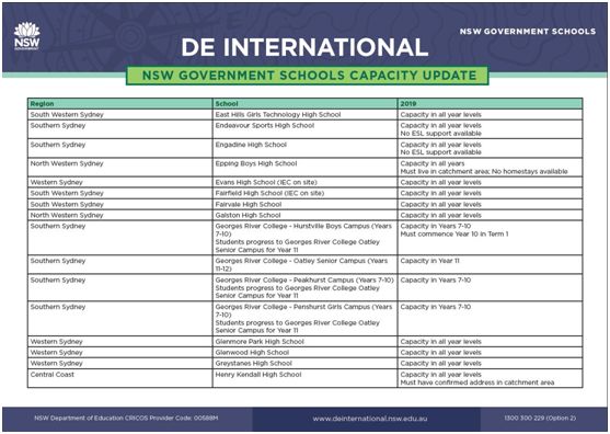 表格说明: capacity=有空位; full=满位;all year levels=所有年级;limited homestays available=住宿家庭位置有限