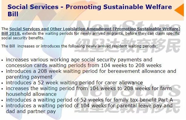 1、各种工作年龄的社会保障金和Concession卡等待期从原来的104周(2年)到208周(4年)