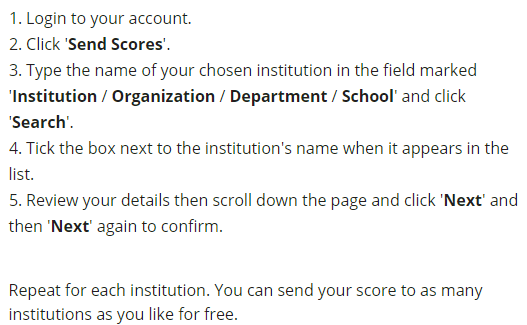 考到想要的PTE成绩之后,如何发送给学校或机构PTE成绩可以无限次发送给各个学校和机构,都是免费的!操作很简单:登陆自己的账号 → 找到自己想要发送的那一次成绩(有的同学考过很多次,请注意不要选错了) → 点击右边的Send Scores → 在接下来的页面填写自己的成绩单要发送的机构 → 确认发送