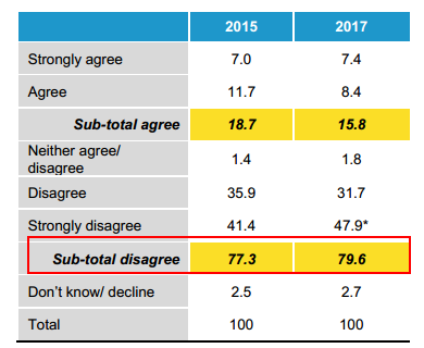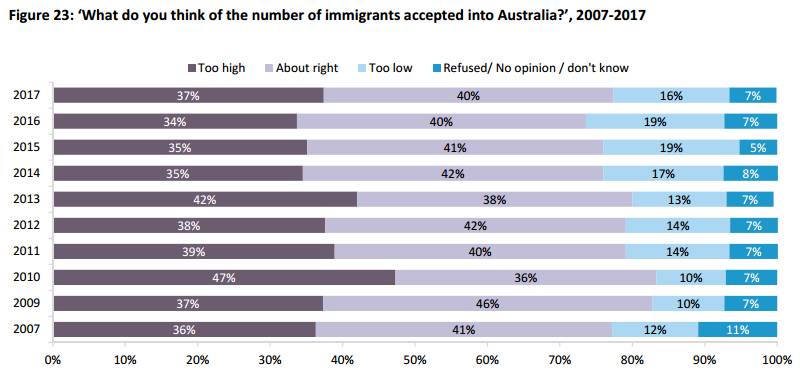 今年的结果显示,对移民的反感好像又增加了一些,37%认为“太高”,同比增加3%,56%觉得“刚刚好”或者“太低。