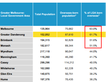 大墨尔本范围内的Melbourne、Greater Dandenong、Brimbank、Monash地区,海外出生人口都超过50%:
