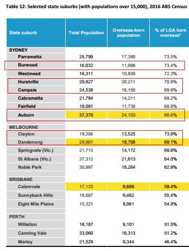 以下的suburb你是不是很熟悉,悉尼的Burwood海外出生人口高达73.4%,墨尔本的Clayton更高73.9%!