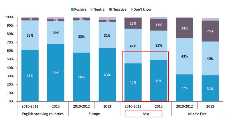 2013年对比2010-12年,对亚洲移民的认同度有上升