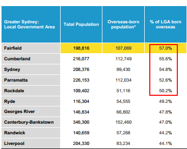 大悉尼范围内的Fairfield、Cumberland、Sydney、Parramatta和Rockdale地区,海外出生人口都超过50%: