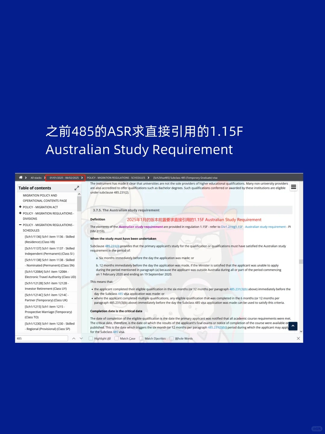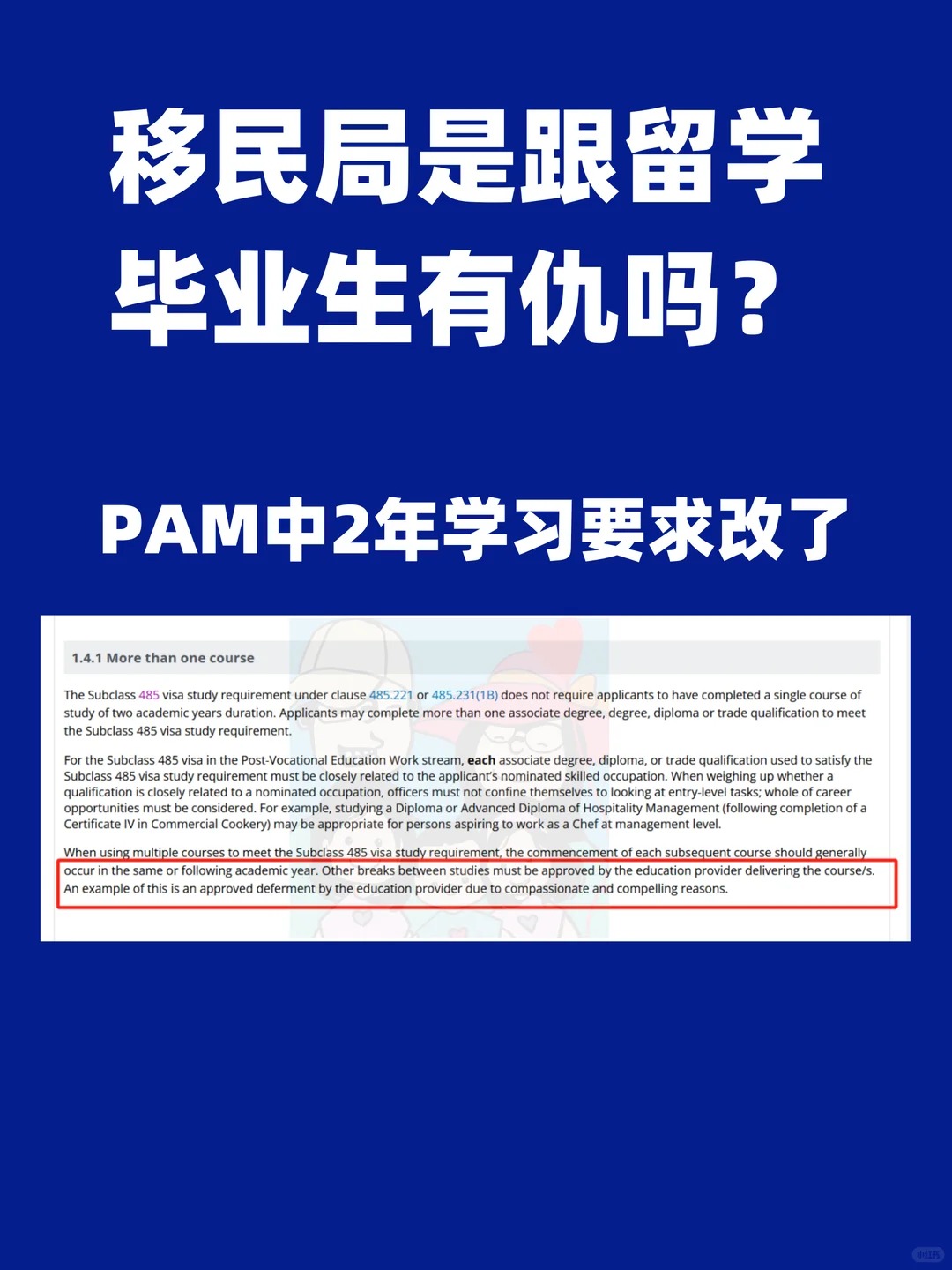 涨价到4600澳币的哀嚎声才刚刚落下,又偷偷搞小动作了,这两天发现485内部审核条例PAM也偷偷改了。对485工签的两年学习要求进行了小补充。以前485的2年学习要求,只要是满足要求的课程,是可以随便拼凑,而且对新旧课程的完成时间,是没有要求,比如你10年前读了1个1年半的课程,然后又来读了1年的课程,也是完全可以满足的。