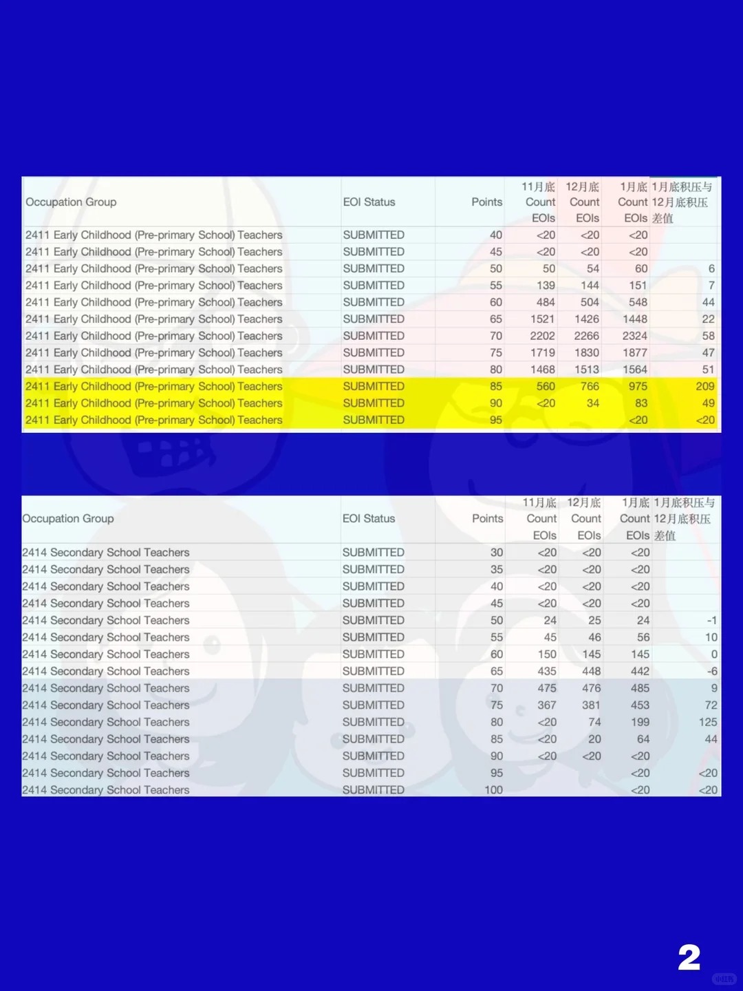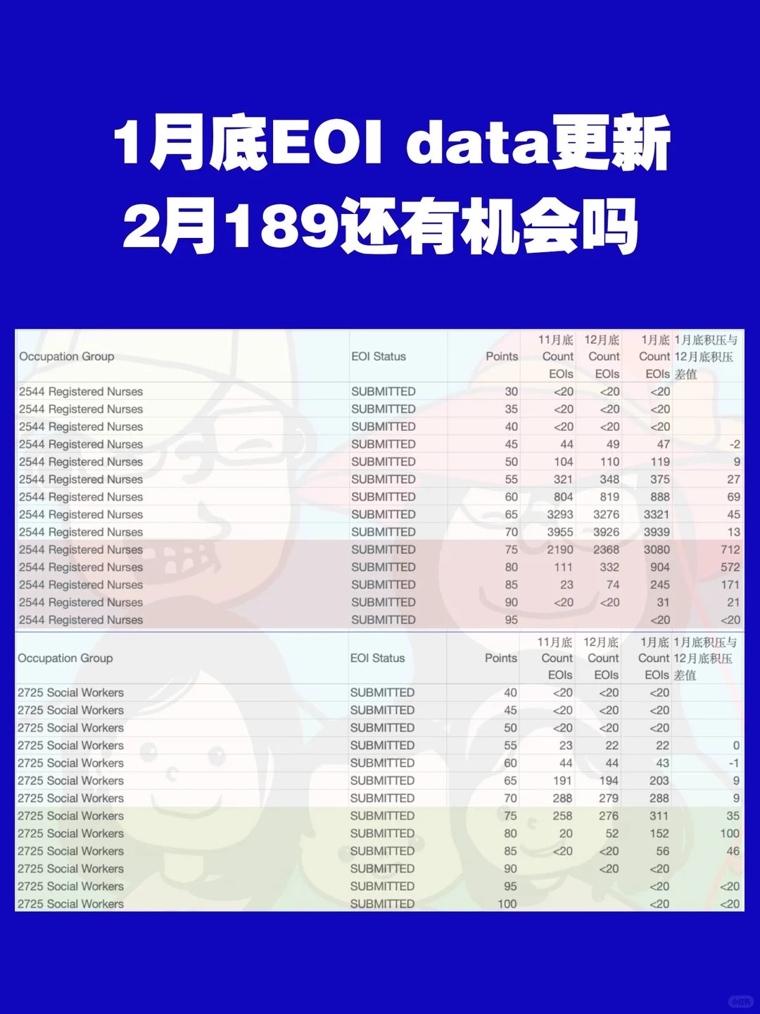1月底EOI数据更新,老规矩来看看三宝中教四大专业的积压情况。按照移民局每季度邀一轮189的节奏看,2月应该会有一轮邀请,今天就根据目前的积压情况来浅预测一下可能的邀请分数